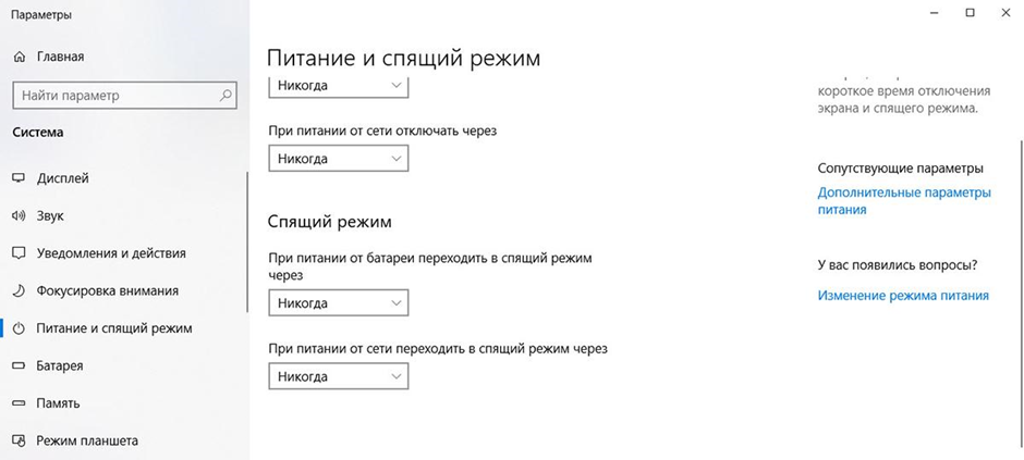 Переходят в раздел «Параметры питания». На устройстве под управлением Виндовс 10 нажимают «Win+I». В появившемся окне находят раздел «Питание и спящий режим». Кликают. И в новом окне клацают на «Дополнительные параметры питания».